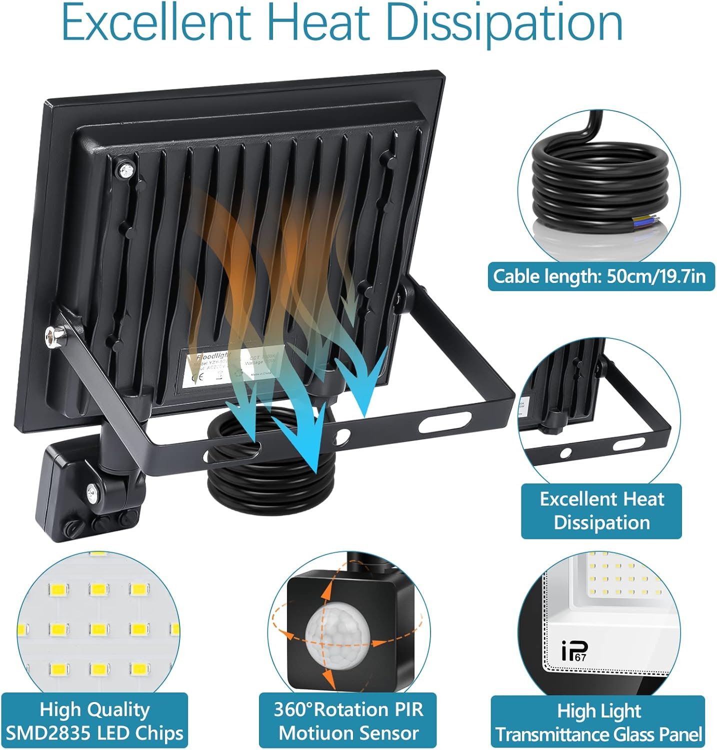 Proiector LED 50W cu senzor de miscare , 5000LM, 7000K, IP67, 3 moduri PIR , Lumina rece pentru