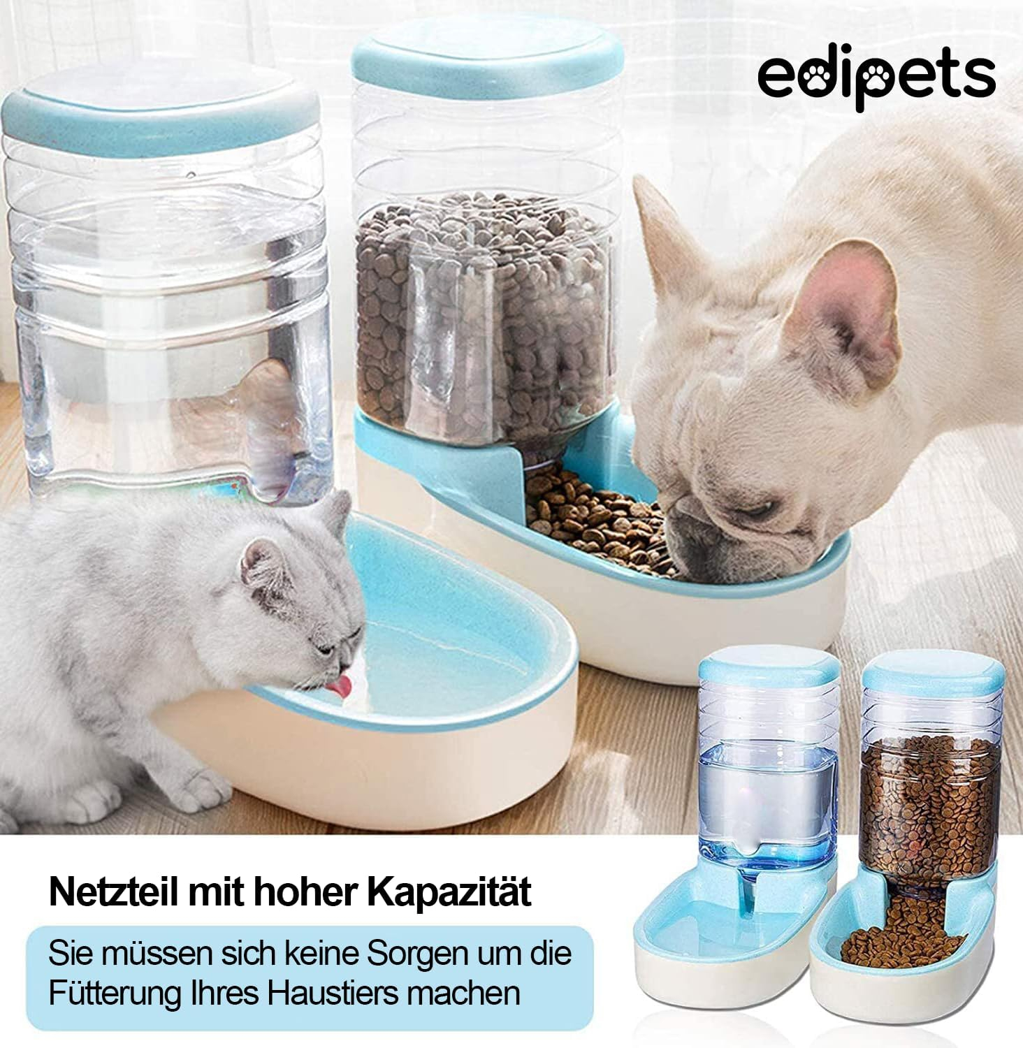 Set 2 dispensere Edipets 3.8L pentru hrana si apa, sistem gravitational, materiale sigure, autonomie de pana la 7 zile. Ideal pentru pisici si caini.