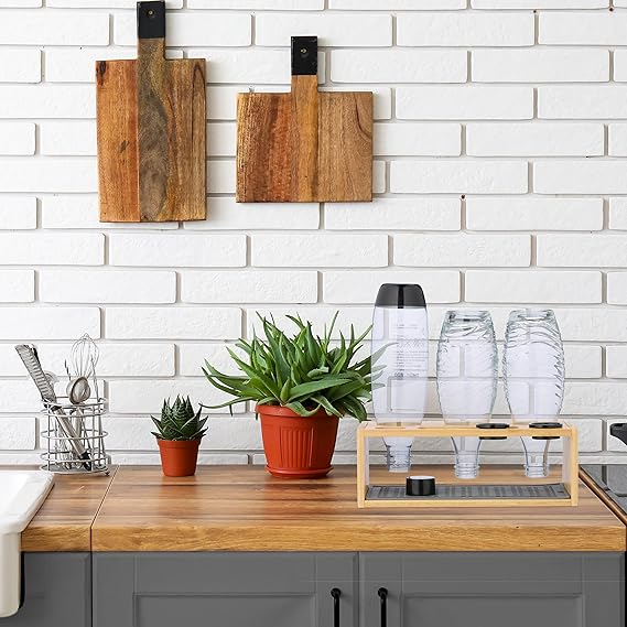 Suport Uscare Sticle Relaxdays Compatibil cu SodaStream, din Bambus, cu Covoras din Silicon si 3 Sup